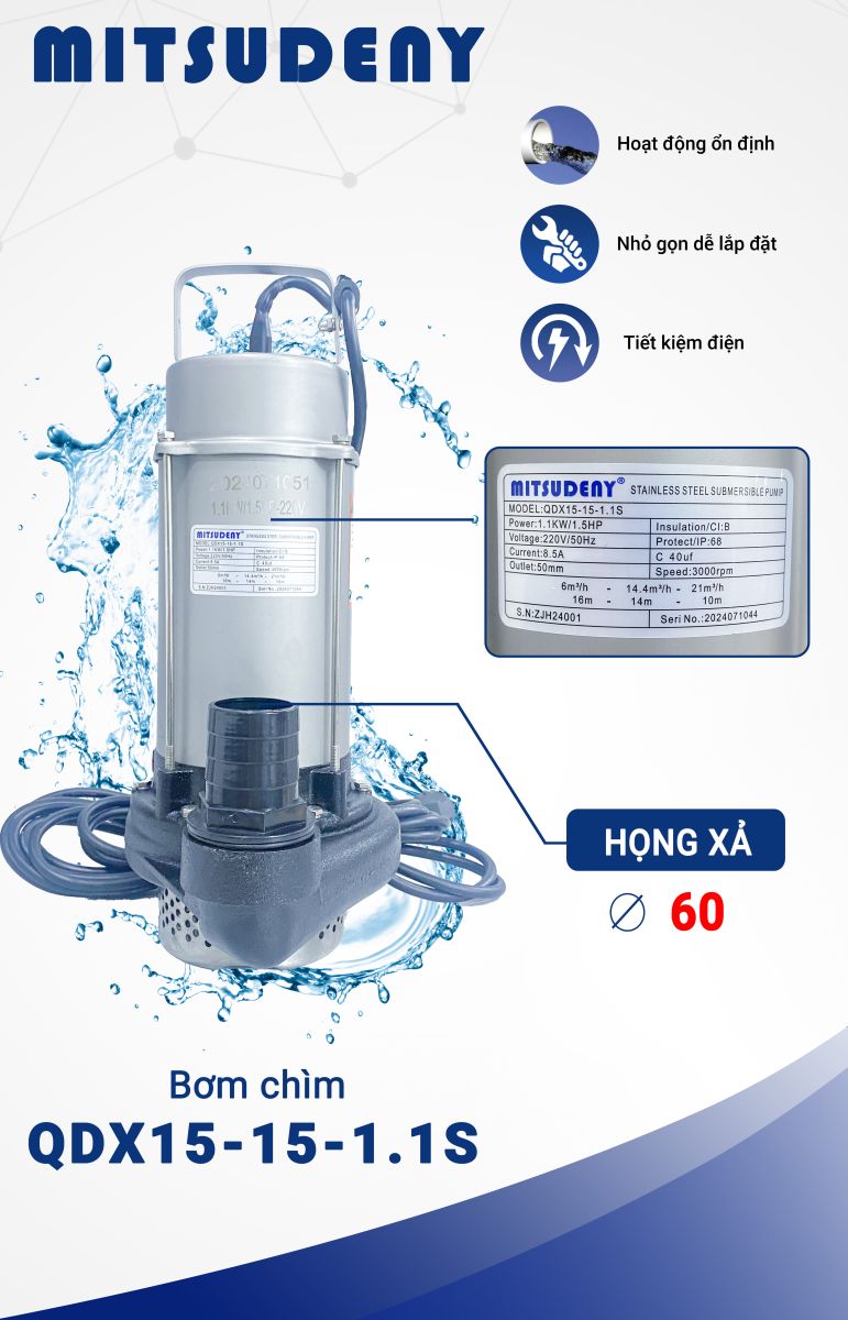 Máy bơm chìm inox ngày càng được ứng dụng rộng rãi nhờ khả năng vận hành bền bỉ, chống ăn mòn và hiệu suất vượt trội. Trong đó, Mitsudeny QDX15-15-1.1S là model mạnh mẽ nhất trong nhóm bơm chìm dân dụng – trang trại – công trình, với hiệu suất cao và độ ổn định đáng tin cậy.