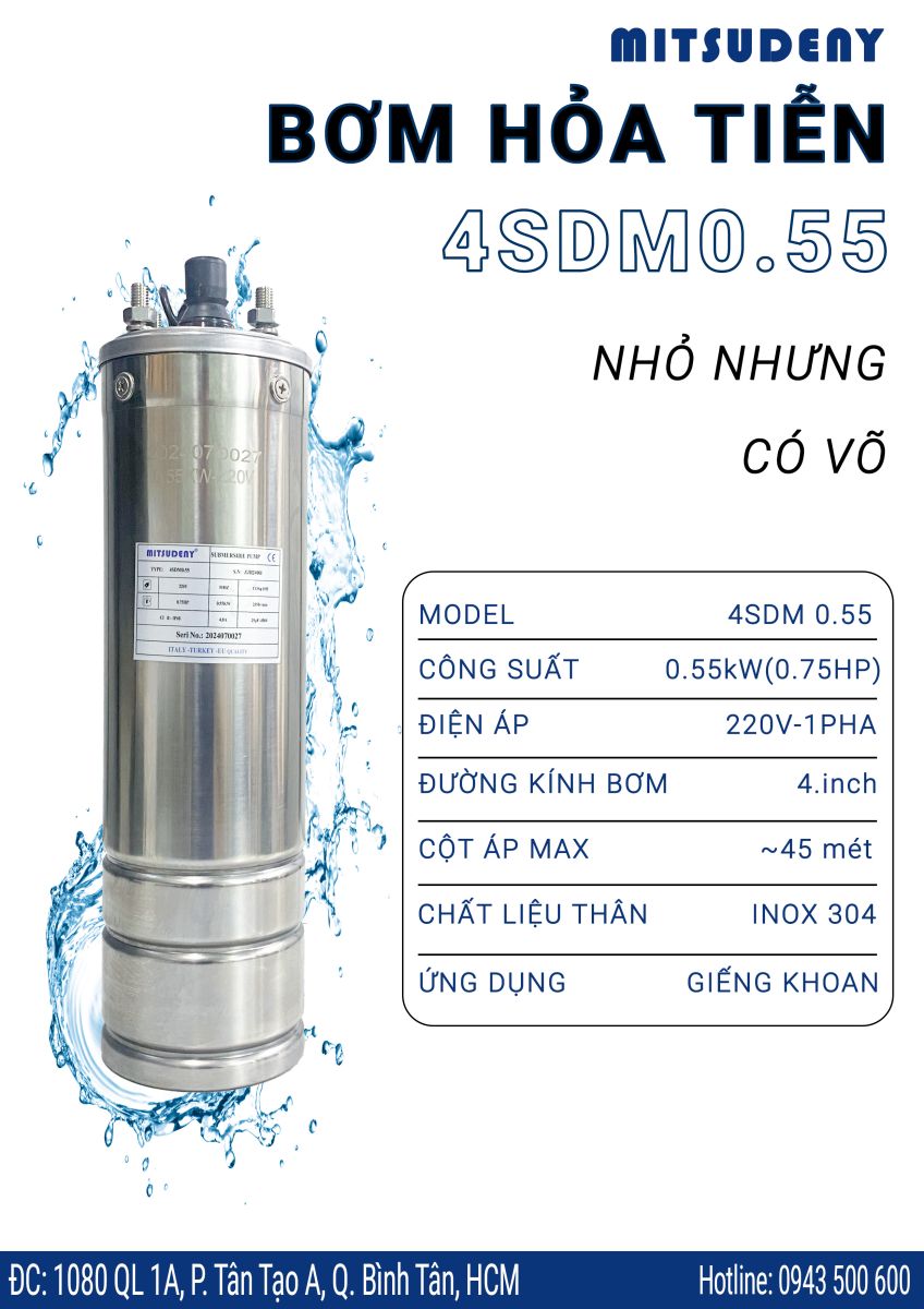 Bơm hỏa tiễn Mitsudeny 4SDM0.55 là lựa chọn tối ưu cho hộ gia đình cần bơm giếng khoan tiết kiệm điện, vận hành bền bỉ và ổn định lâu dài.