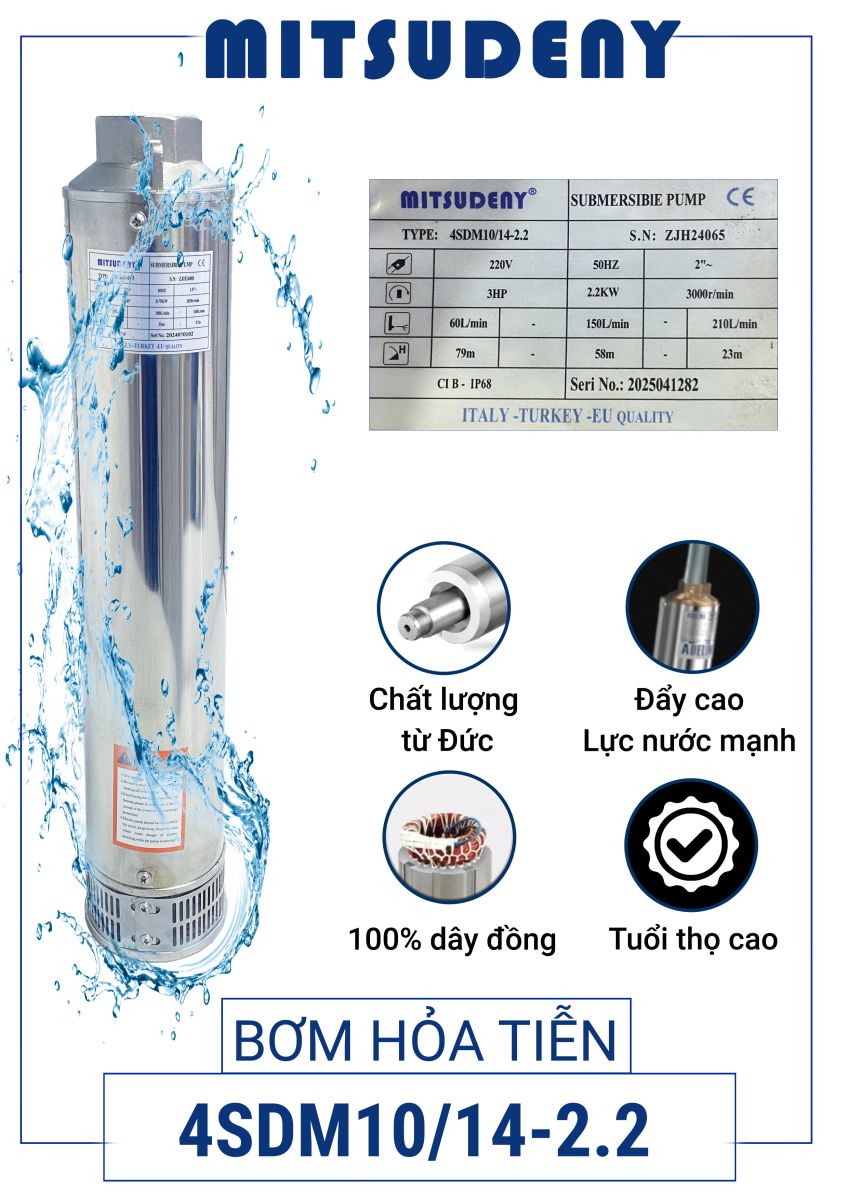 Bơm hỏa tiễn Mitsudeny 4SDM10/14-2.2 là lựa chọn tối ưu cho nhu cầu bơm mạnh – lưu lượng lớn – độ bền cao – giá tốt.
