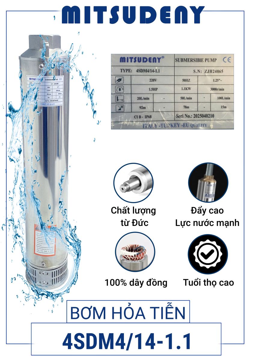Bơm hỏa tiễn Mitsudeny 4SDM4/14-1.1 là lựa chọn tuyệt vời cho nhu cầu bơm nước giếng khoan dân dụng: mạnh – bền – tiết kiệm điện – giá tốt. Phù hợp hộ gia đình, trang trại nhỏ và công trình dân dụng cần nguồn nước ổn định.