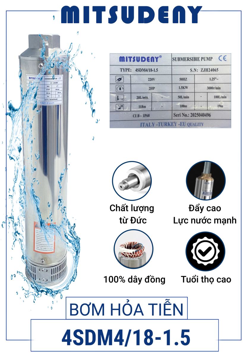 Bơm hỏa tiễn Mitsudeny 4SDM4/18-1.5 là dòng bơm chìm giếng khoan chất lượng cao, vận hành mạnh mẽ và ổn định, phù hợp cho giếng khoan 4 inch. Với tiêu chuẩn Italy – Turkey – EU Quality, sản phẩm đáp ứng đầy đủ các yêu cầu về độ bền, khả năng chống ăn mòn và hiệu năng bơm cho hộ gia đình, trang trại và công trình dân dụng.