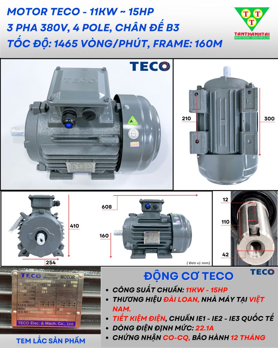 Động Cơ Điện 3 Pha TECO 11kW 15HP – 4 Pole – 1465 RPM – IP55
