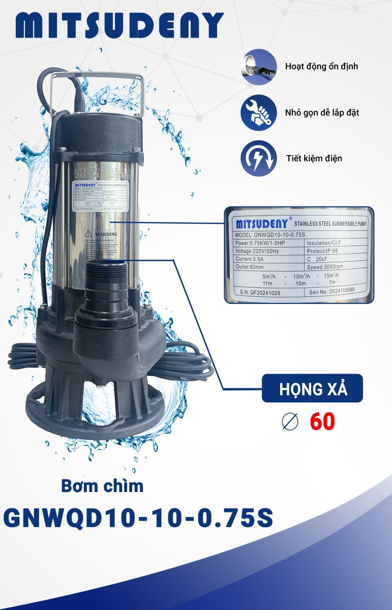 Máy bơm chìm inox Mitsudeny là dòng thiết bị được tin dùng rộng rãi nhờ độ bền cao, khả năng làm việc ổn định và an toàn trong môi trường nước. Model GWNQ10-10-0.75S, công suất 0.75kW/1HP, sử dụng điện 220V, là lựa chọn lý tưởng cho các nhu cầu bơm nước sinh hoạt – tưới tiêu – thoát nước – bơm hồ cá – bơm bể ngầm.