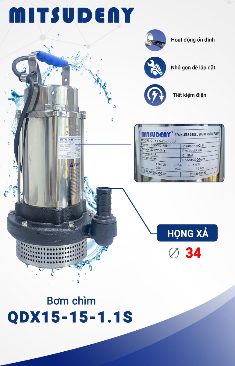 Trong những năm gần đây, máy bơm chìm inox ngày càng trở thành thiết bị quan trọng trong gia đình, nông nghiệp và các hệ thống công trình. Đặc biệt, dòng Mitsudeny QDX1.5-25-0.55S nổi bật với chất lượng bền bỉ, thiết kế chắc chắn và hiệu quả vận hành vượt trội. Đây là model được nhiều người dùng tin tưởng nhờ khả năng bơm nước sạch mạnh mẽ, đẩy cao tốt và hoạt động ổn định trong môi trường chìm hoàn toàn.