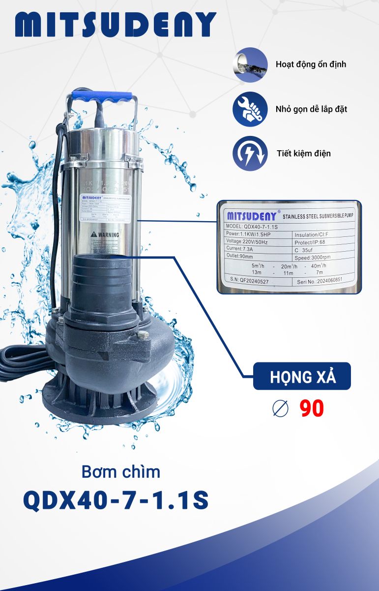 Máy bơm chìm inox Mitsudeny luôn được đánh giá cao về độ bền, hiệu suất và khả năng vận hành ổn định. Trong đó, Mitsudeny QDX40-7-1.1S là dòng bơm lưu lượng lớn chuyên dùng cho thoát nước, xử lý nước thải nhẹ, tưới tiêu và các nhu cầu bơm nước diện rộng.