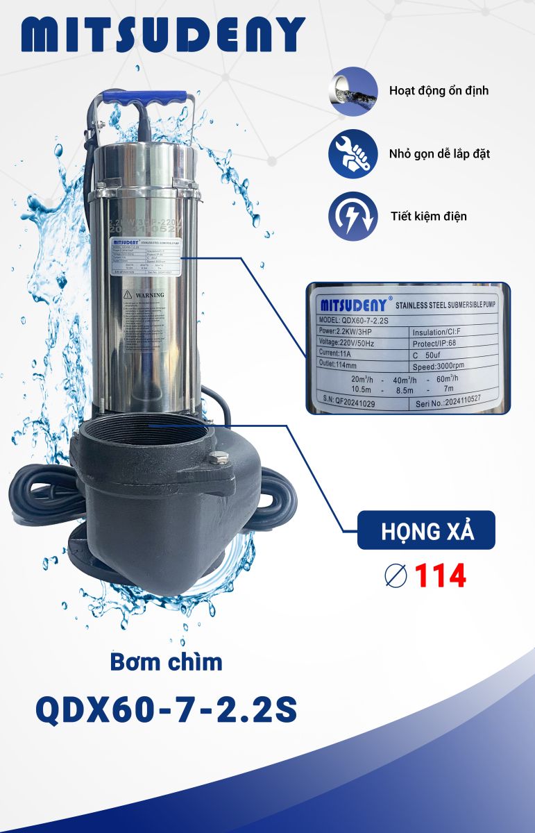 Máy bơm chìm inox Mitsudeny là thương hiệu được ưa chuộng trong nhiều lĩnh vực nhờ độ bền cao, thiết kế chắc chắn và hiệu suất mạnh mẽ. Trong đó, model QDX60-7-2.2S là dòng bơm lưu lượng lớn – xả cực nhanh, phù hợp cho thoát nước, ao hồ, trang trại, công trình và các diện tích cần lượng nước lớn.