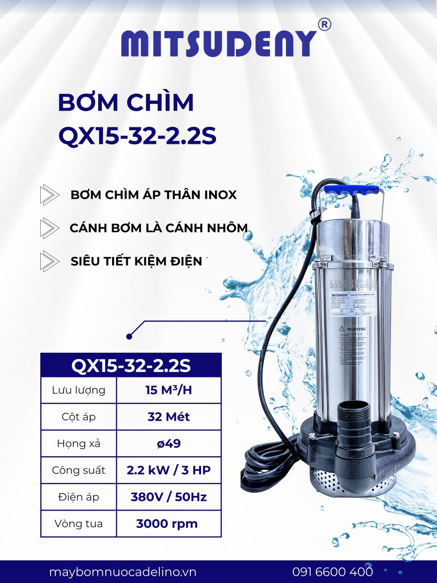 MÁY BƠM CHÌM INOX MITSUDENY QX15-32-2.2S – 2.2KW / 3HP – CỘT ÁP 36M – GIẢI PHÁP BƠM NƯỚC CÔNG SUẤT LỚN