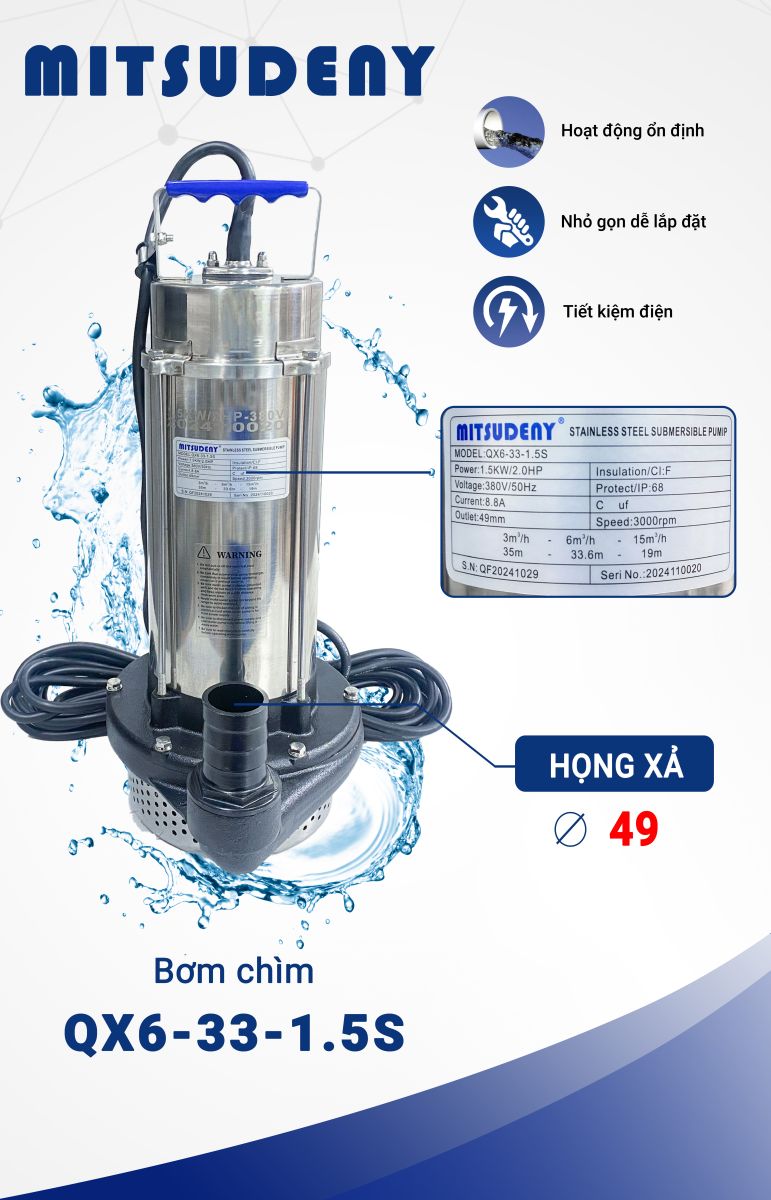 MÁY BƠM CHÌM INOX MITSUDENY QX6-33-1.5S – 1.5KW / 2HP – CỘT ÁP 35M – HIỆU SUẤT CAO, ĐỘ BỀN VƯỢT TRỘI