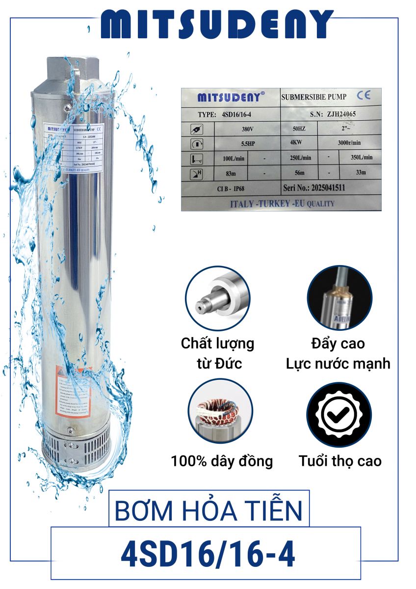 Bơm hỏa tiễn Mitsudeny 4SD16/16-4 là lựa chọn hoàn hảo cho hệ thống cấp nước giếng khoan cần lưu lượng cực lớn – áp lực mạnh – vận hành bền bỉ. Sản phẩm phù hợp từ hộ gia đình, trang trại đến xưởng sản xuất và công trình.