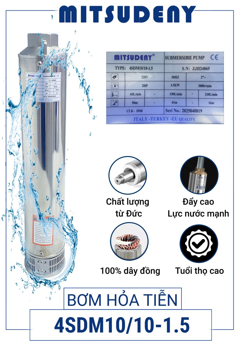 Bơm hỏa tiễn Mitsudeny 4SDM10/10-1.5 là dòng bơm chìm giếng khoan chuyên dụng, được thiết kế cho nhu cầu lưu lượng cực lớn, phù hợp tưới tiêu, trang trại và cấp nước tổng.