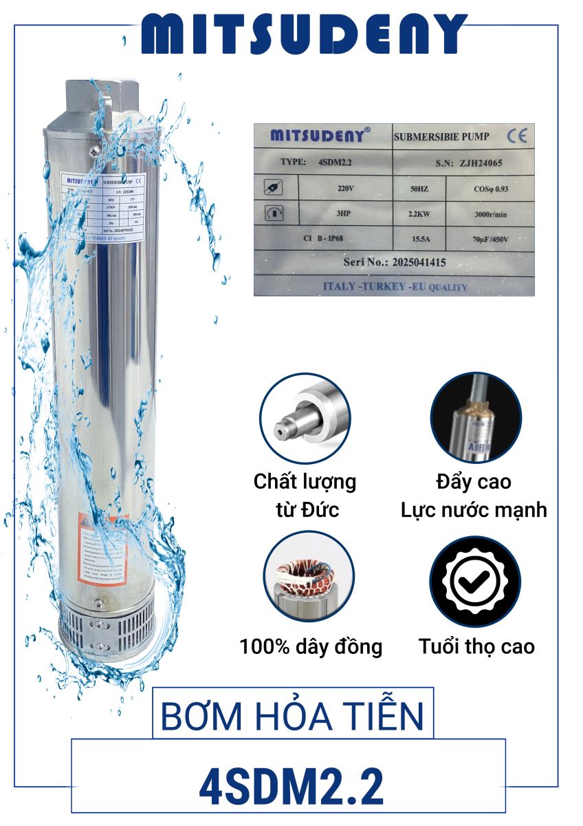 Bơm hỏa tiễn Mitsudeny 4SDM2.2 là dòng bơm chìm giếng khoan công suất 3HP, chuyên dùng cho nhu cầu bơm nước sạch từ giếng khoan đường kính 4 inch.