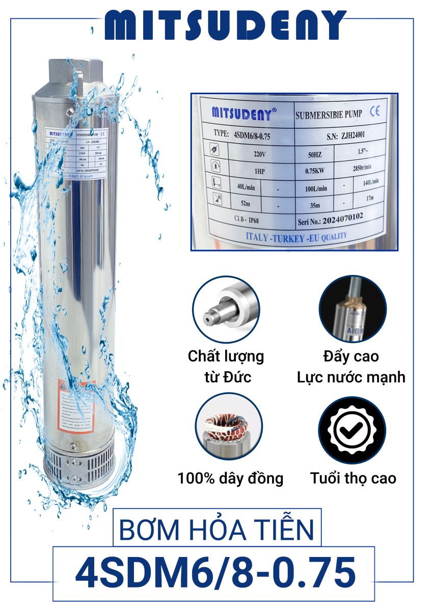 Mitsudeny 4SDM6/8-0.75 là giải pháp lý tưởng cho hộ gia đình, trang trại và công trình cần bơm mạnh – bền – tiết kiệm điện.